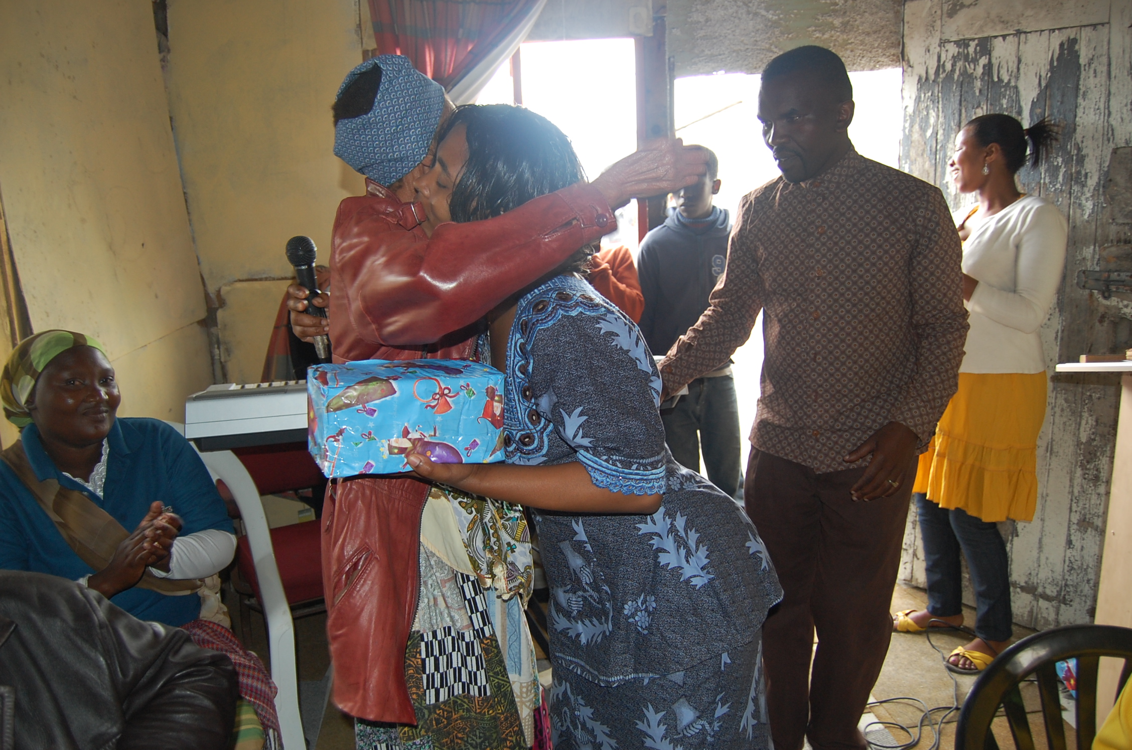 Children and the elderly at the church Christmas party receiving gifts.